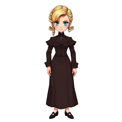 a refined aristocratic woman in anime style, standing with an elegant and imposing posture. she has blonde hair styled in a braided bun with curled side strands framing her face. her expression is stern and confident, with sharp blue eyes. she wears a vic