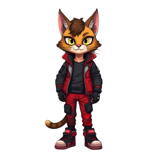 gato humaide , ciberpunk , estilo de ropa callejo , de color narajo , estilo anime , ropa poleron rojo , chaqueta negra , pantalon rojo , y zapatillas tecnologias y guantes con tecnologia