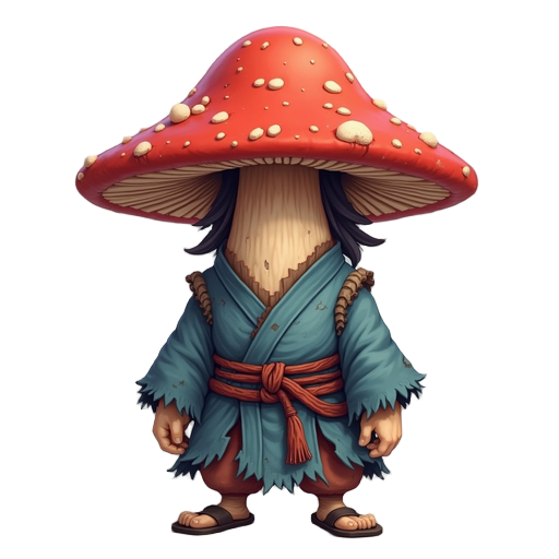 mushroom samurai. a mycelium warrior with a broad red amanita mushroom cap for a hat. body made of bark-like fungal fibers, wearing a tattered blue kimono