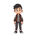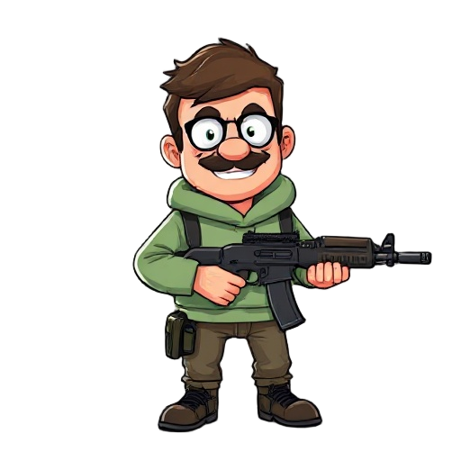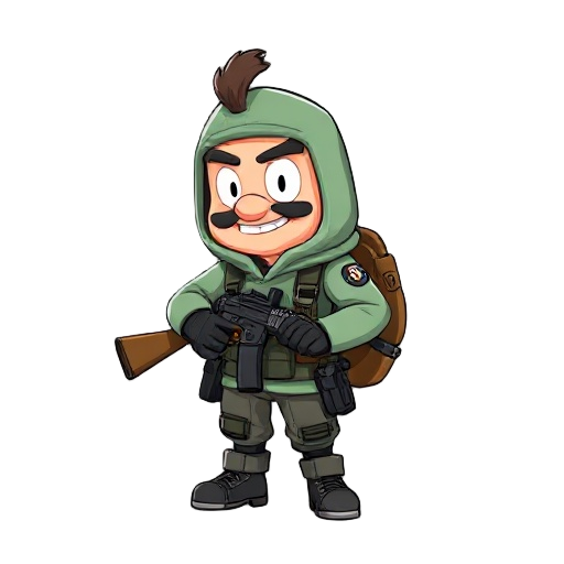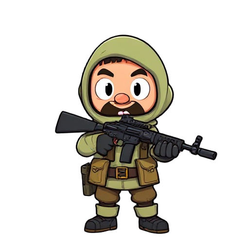 пиксель арт грязная белая футболка с надписью "survivor" · зеленая тактическая кепка с нашивкой · черные походные штаны с карманами · разбитые армейские ботинки · тактический жилет с магазинами · модифицированный ак-74 с прицелом