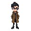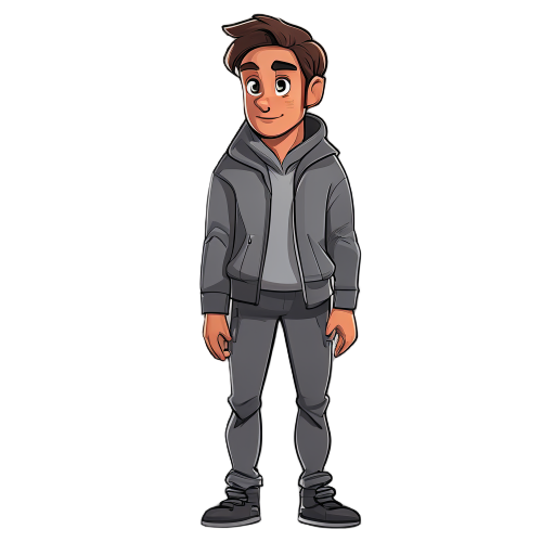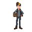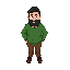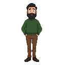 he is a middle-aged man with dark hair and a full beard. he wears a green sweater, brown corduroy pants, and shoes.