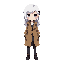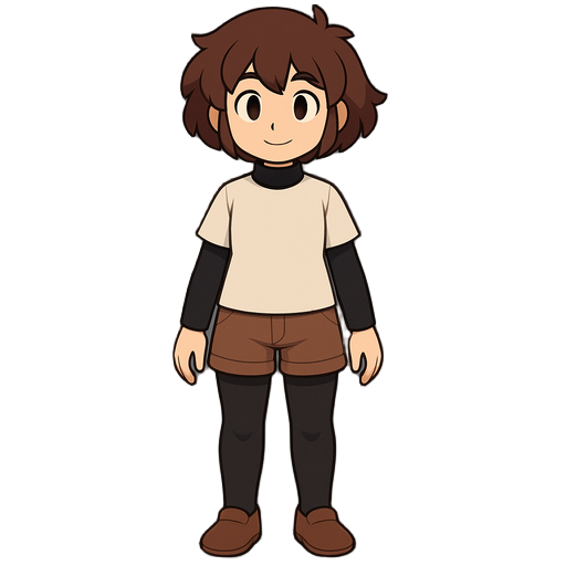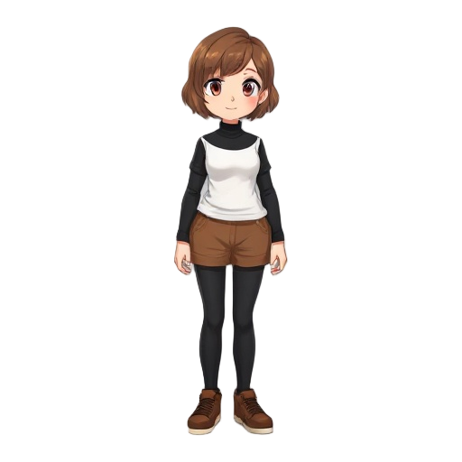 a girl with short brown fluffy hair, a long sleeved black turtle neck undershirt, a white short sleeved overshirt, black leggings and brown shorts with brown shoes.