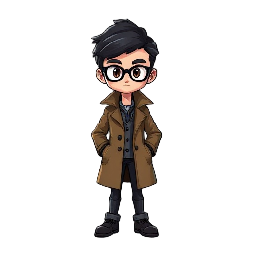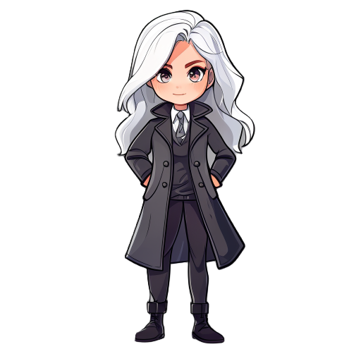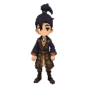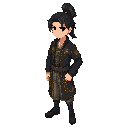 a young man with long dark hair tied in a high ponytail, adorned with a few strands of lighter color, stands confidently. he wears a dark, ornate coat with intricate golden patterns, possibly depicting mythical creatures or elegant scrollwork, over a ligh