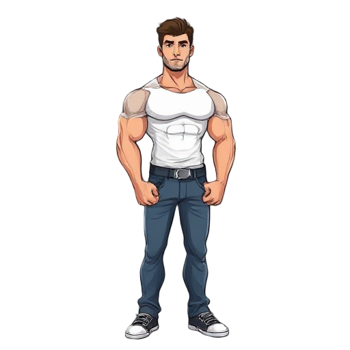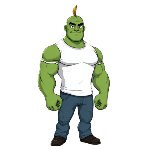 muscled man, fin on the head, green skin, bald, white t-shirt, jeans