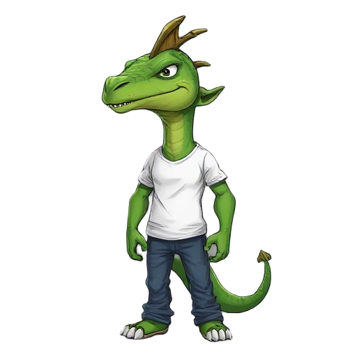 the savage dragon, fin on the head, green skin, bald, white t-shirt, jeans