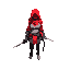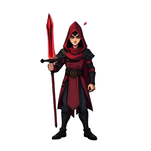 personagem, feminina, encapuzada, duas adagas na mão, capa vermelha