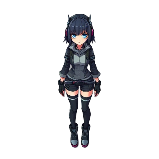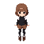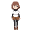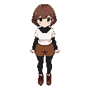 a girl with short brown fluffy hair, a long sleeved black turtle neck undershirt and a white short sleeved, black leggings and brown shorts with brown shoes.