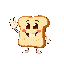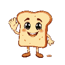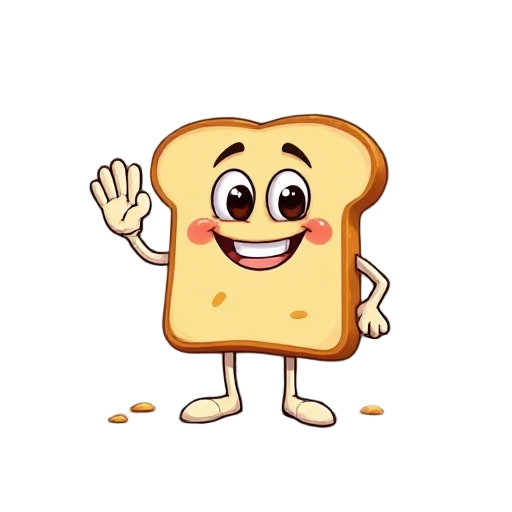 bread slice with eyes and limbs, big smile. has a few crumbs around it. is slightly toasted. waves one hand saluting.