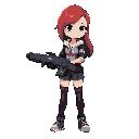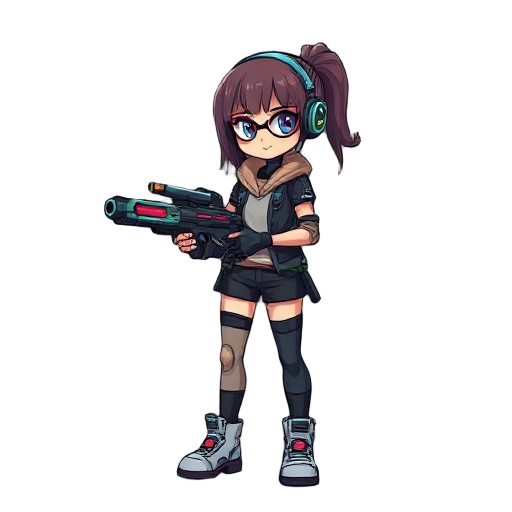 cyberpunk girl with a futuristic gun, red hair, facing sidewards
