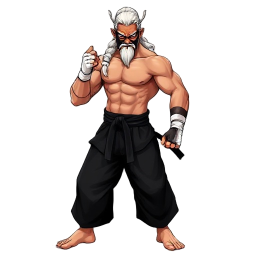 Prompt: a street fighter with a well-defined physique, wearing black matte kimono pants, adopting a shotokan karate stance, but very emphatic, with a tengu mask and a black goatee, long white hair tied in a ponytail, shirtless, barefoot, with white fighter wraps
