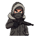 Prompt: a stoic sniper inspired by simo hayha, wearing a long winter coat with hood and fur, face covered by a wool mask showing only cold eyes