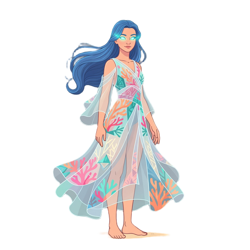2d game character concept art, side view facing right, mystical female warrior, tropical island theme, light flowing dress, fluid fabric, translucent layers with geometric coral patterns, no weapons, hands free and relaxed, blue long hair flowing in the