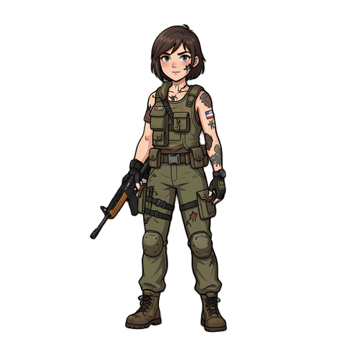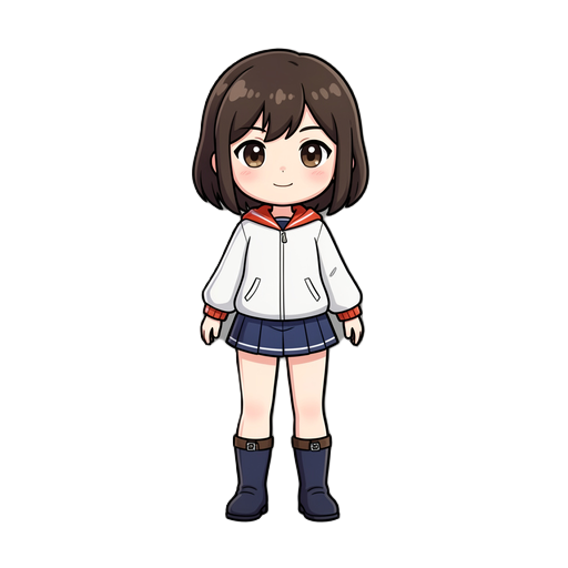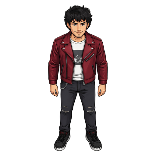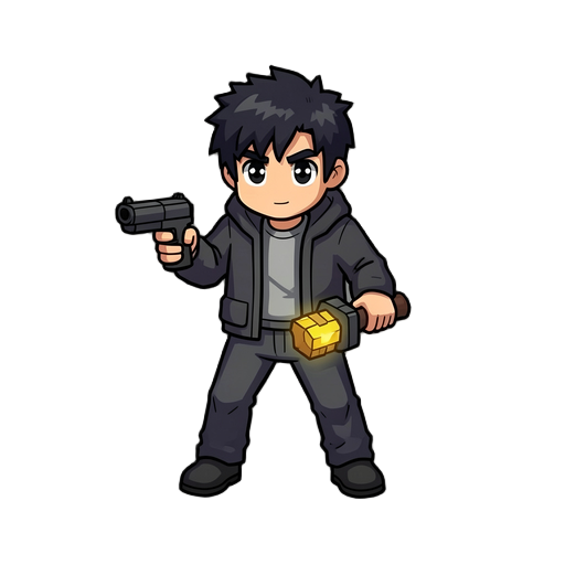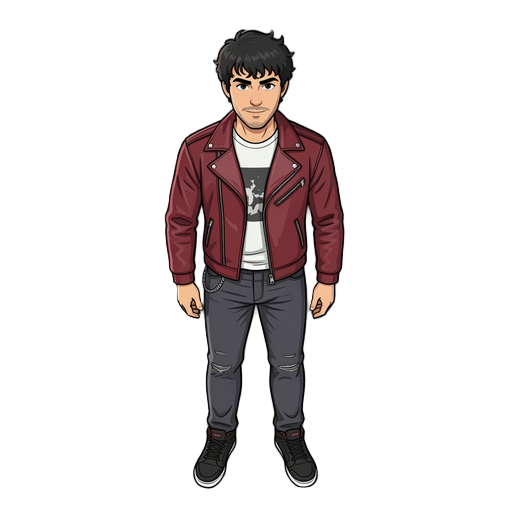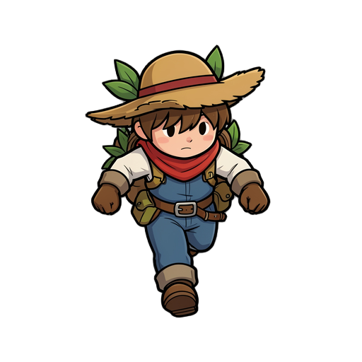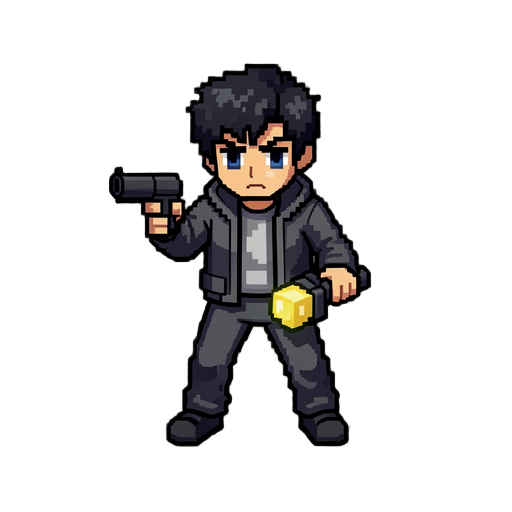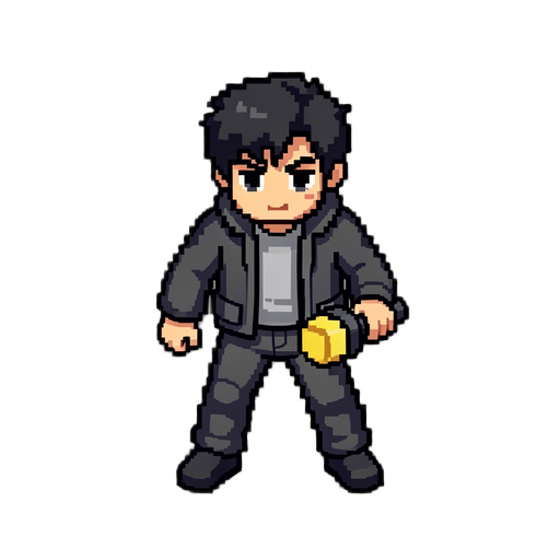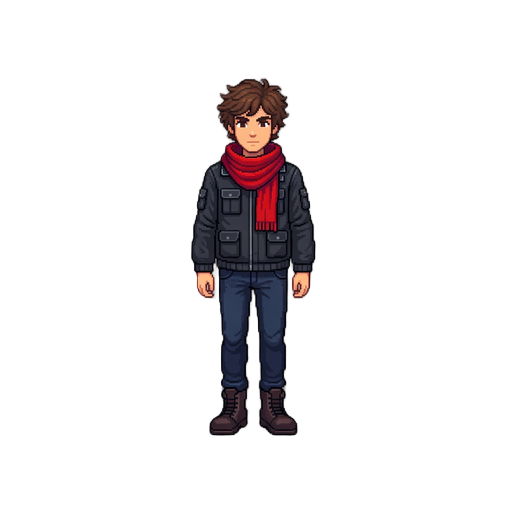 full character sprite, 32x48 pixel size per frame, top-down perspective. a protagonist with brown messy hair and a distinctive red scarf. wearing modern, grounded clothing: a dark grey utility jacket, slim navy denim pants, and sturdy leather boots. minim