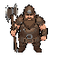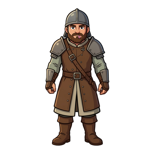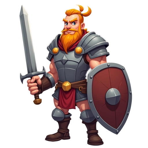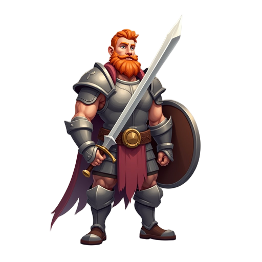 un enano bajo y muy robusto, de cuerpo ancho y compacto, con una silueta casi cuadrada. tiene una barba grande y densa de forma definida, lleva un casco minero pesado y viste una armadura gruesa con aspecto sólido. empuña un hacha enorme y desproporcionad