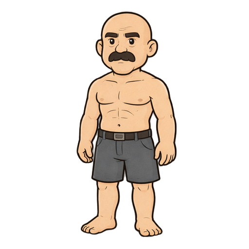 hombre sin camiseta, calvo y con bigote