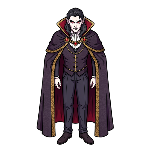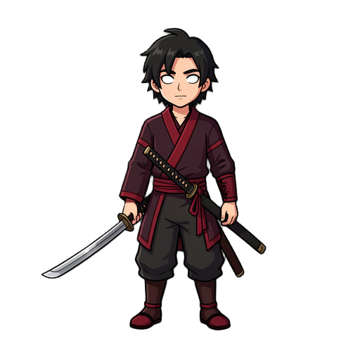 faça um personagem com uma roupa escura e vermelho vinho com uma katana, ele tem cabelos negros, olhos brancos