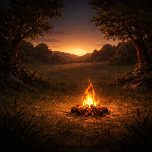 a dark fantasy cinematic scene set during twilight (late sunset transitioning into night). a quiet open pasture under a dim sky, with a faint orange and purple sunset glow on the horizon. in the right-center of the scene, a small campfire burns softly, ca