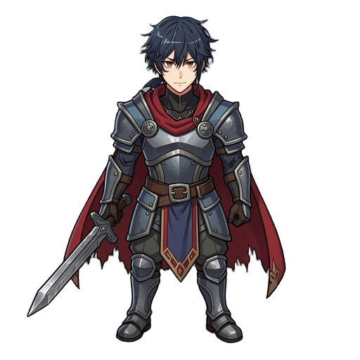 he is named kayan he wear low level games armor and weilding iron sword with red cutted cape